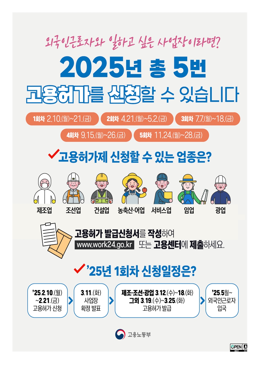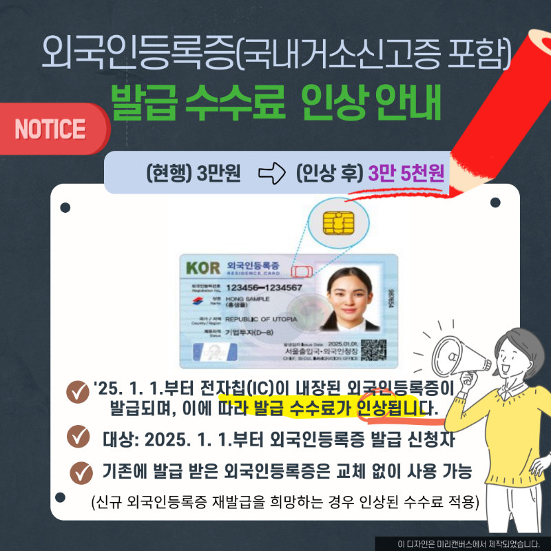 홍보자료 검색키 선택 제목 내용 작성자명 검색어 입력 K-HaMi 프로젝트 2025.02.04 외국인등록증발급수수료 2025.01.29 외국인등록증이 스마트폰으로 2025.01.28 2025년 신규고용허가 신청시기 2025.01.26 한국어능력시험(EPS-TOPIK) 한국어 표준교재 개편 안내 2024.12.27 2025년 최저임금 전단지_최저임금위원회 2024.12.26 2025년 최저임금 안내문_최저임금위원회 2024.12.26 외국인 안전 앱이란 2024.11.20 Emergency Ready App 2024.11.20 근로복지공단 베트남어 상담개시 2024.10.17 < 1 2 3 4 5 6 7 8 9 10 >