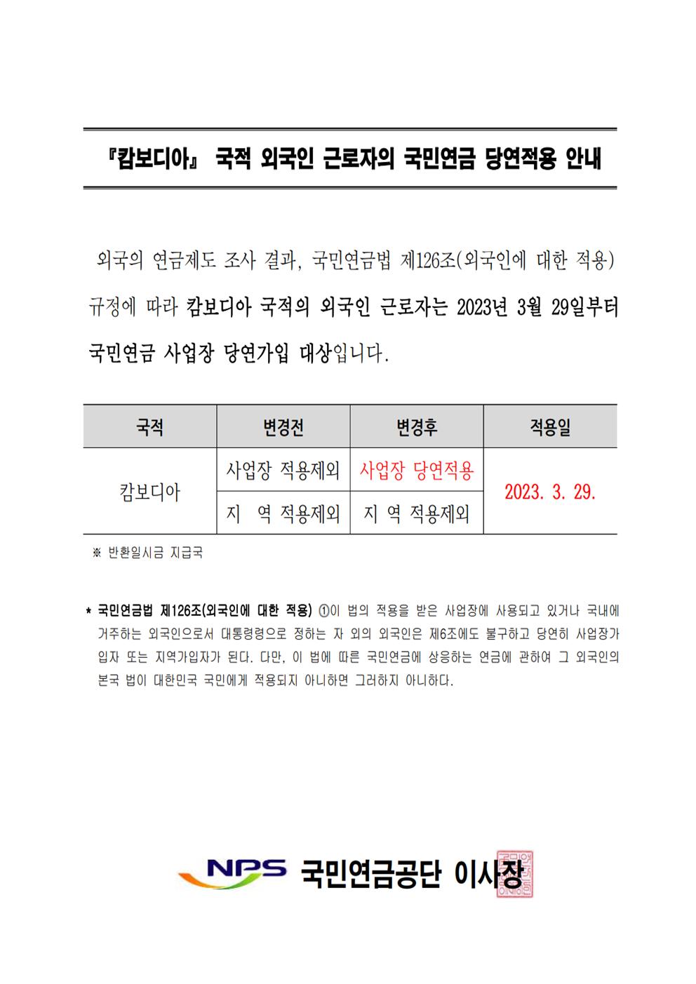 자료실 캄보디아국적 근로자 국민연금 당연적용_국민연금관리공단 외국인력상담센터 등록일2023.04.12 조회수2,369 이전글 귀국비용 및 상해보험료 공제 동의서 다음글 국민건강보험공단 외국인민원센터 위치 목록