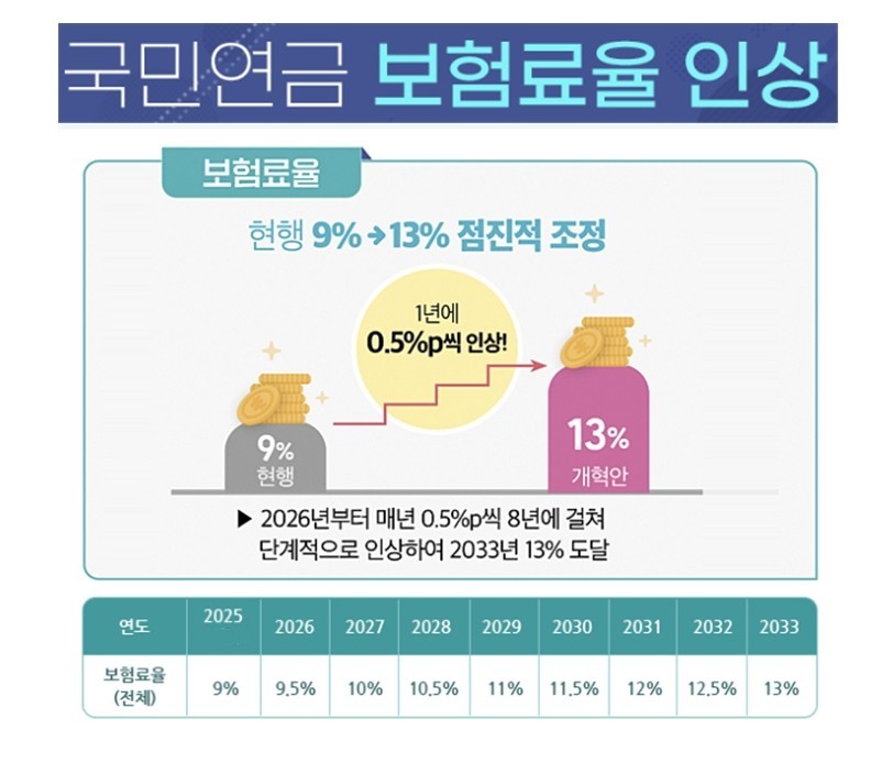 자료실 국민연금 보험료율 인상_국민연금공단 외국인력상담센터 등록일2026.01.12 조회수126 국민연금 보험료가 2026년부터 2033년까지 매년 0.5%씩 인상됩니다. 자세한 사항은 국민연금공단 1355로 문의 이전글 이전글이 없습니다. 다음글 휴면보험금 신청 서식 및 연락처_한국산업인력공단 목록