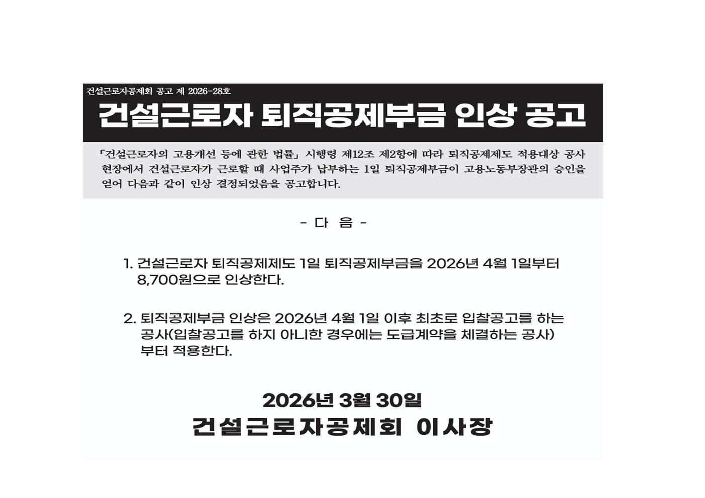 홍보자료 검색키 선택 제목 내용 작성자명 검색어 입력 건설근로자 퇴직공제부금 인상 공고_건설근로자공제회 2026.03.30 동포 통합 정책_법무부 2026.02.12 한파영향예보_수도권기상청 각나라 언어는 첨부파일 참조하세요 2026.01.29 2026년 신규 고용허가 신청 일정 2026.01.15 건설업 기초안전보건교육 이수증 모바일 앱(건설안전패스) _ 안전보건공단 `25.7.1. 서비스 개시한 건설업 기초안전보건교육 이수증 모바일 앱(건설안전패스) 2026.01.13 외국인근로자를 위한 통역지원 서비스_고용노동부 아래 QR코드로 최신 연락처를 확인 하실 수 있습니다. 2026.01.11 홍역예방은 필수_질병관리청 2026.01.08 2026년도 국민건강보험료_국민건강보험공단 2025.12.21 AI노동법(다국어)_고용노동부 2025.12.14 2026년 최저임금 전단지_최저임금위원회 2025.12.05 <1 2 3 4 5 6 7 8 9 10 >
