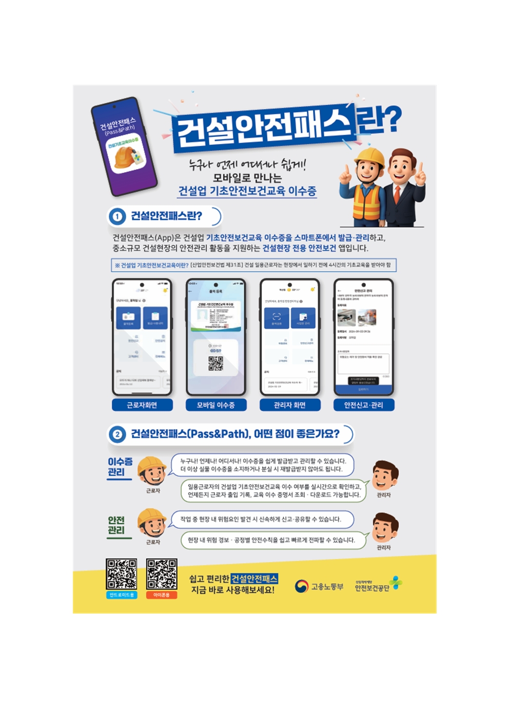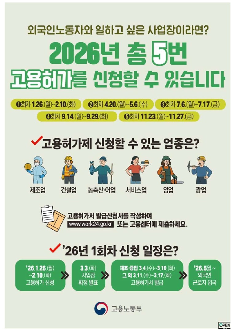 홍보자료 검색키 선택 제목 내용 작성자명 검색어 입력 동포 통합 정책_법무부 2026.02.12 한파영향예보_수도권기상청 각나라 언어는 첨부파일 참조하세요 2026.01.29 2026년 신규 고용허가 신청 일정 2026.01.15 건설업 기초안전보건교육 이수증 모바일 앱(건설안전패스) _ 안전보건공단 `25.7.1. 서비스 개시한 건설업 기초안전보건교육 이수증 모바일 앱(건설안전패스) 2026.01.13 외국인근로자를 위한 통역지원 서비스_고용노동부 아래 QR코드로 최신 연락처를 확인 하실 수 있습니다. 2026.01.11 홍역예방은 필수_질병관리청 2026.01.08 2026년도 국민건강보험료_국민건강보험공단 2025.12.21 AI노동법(다국어)_고용노동부 2025.12.14 2026년 최저임금 전단지_최저임금위원회 2025.12.05 외국인근로자 전용보험 출국만기보험 공항수령(위치) 2025.12.05 <1 2 3 4 5 6 7 8 9 10 >